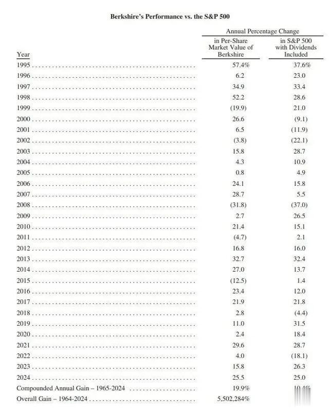 更让人羡慕的是,1965至2024年,伯克希尔每股市值的复合年增长率是19.9%,标普500是10.4%。