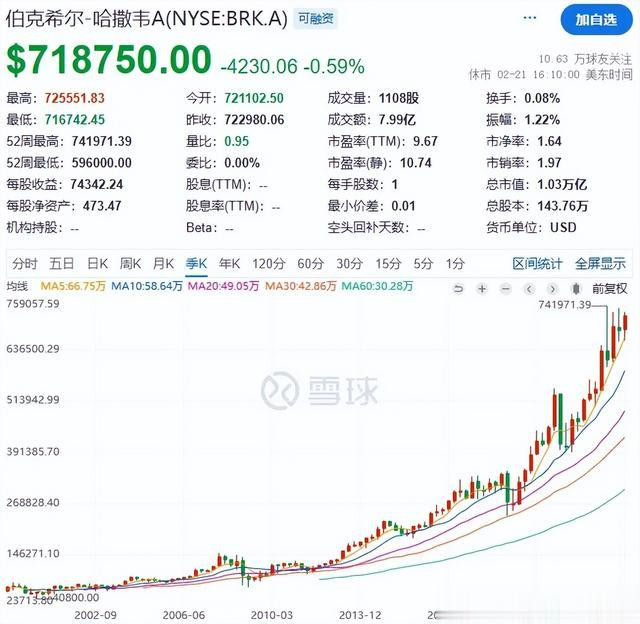 如今,伯克希尔的股价,已经去到71.87万美元/股,羡煞股民。